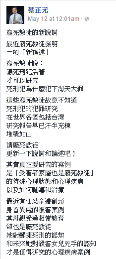 寫這篇文章的動機來自看到蔡正元立委前幾天的FB動態。蔡委員認為小燈泡的媽媽因為是「廢死教徒」,所以才是「值得被研究的心理疾病案例」。看到底下對於小燈泡媽媽的評論更是傻眼:「小燈泡媽媽的過度理性其實讓我覺得有點冷血」「我為對小燈炮感到悲哀,怎會有這樣的媽媽?」(我對於蔡委員和部分網友的評論,在本篇文章的最後面。有興趣的可以往下滑去看)