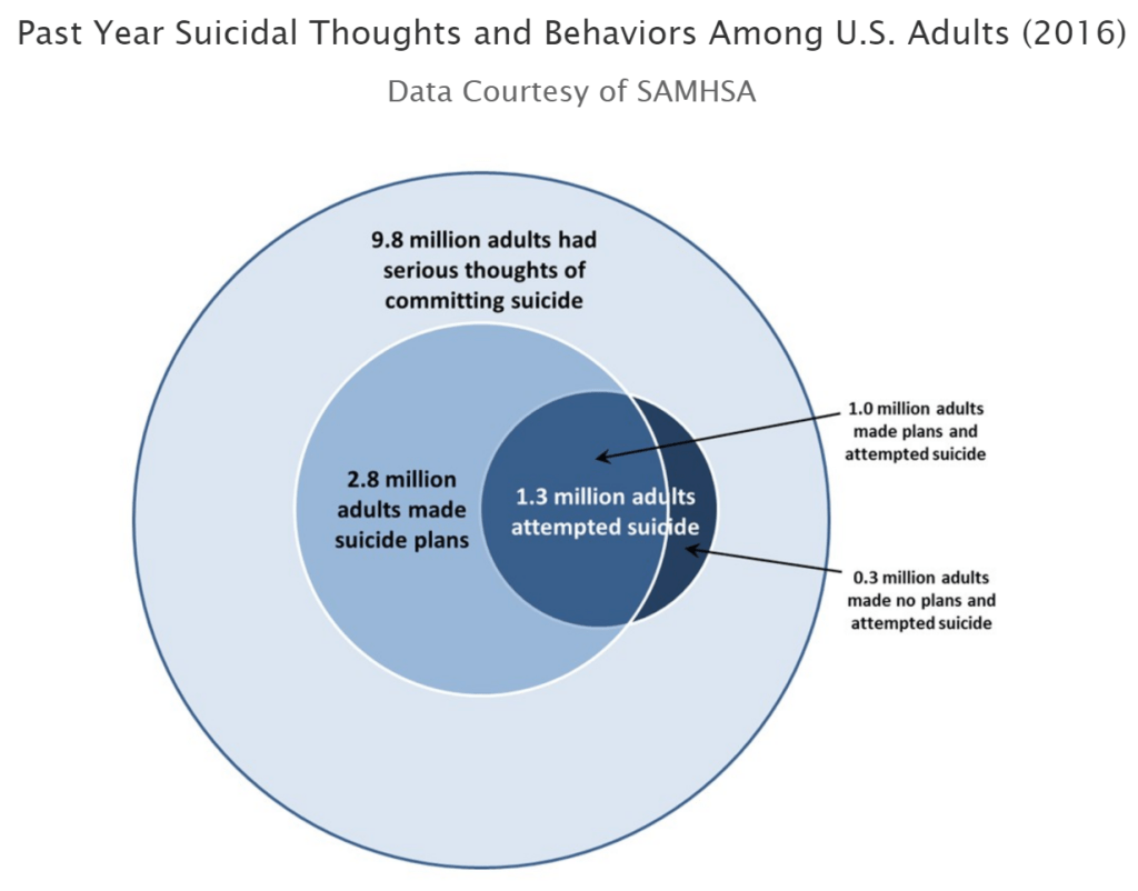 自殺念頭不會不常見,有自殺念頭不代表一定有自殺意圖,例如:「我想死,但我因為宗教因素不打算自殺。」2016年美國估計有980萬人曾經有自殺念頭,在這些人中,有280萬人曾經計畫過如何自殺。在130萬個企圖自殺的人中,有100萬人有計畫過如何自殺,而有30萬人沒有事先計畫或預想。因此,自殺念頭固然要密切注意,但更重要的是要進一步評估自殺意圖及自殺計劃。
