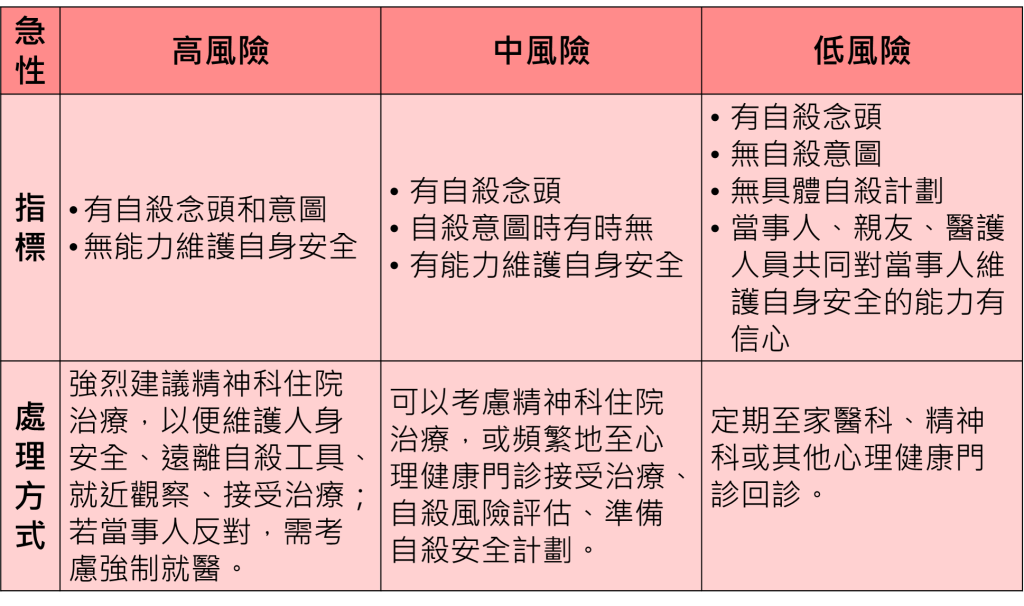 「高急性風險」的警訊還包括有具體的自殺計劃、為自殺準備做準備、近期曾經企圖自殺過、無法列舉活下去的理由。危險因子包括容易取得自殺工具以及生活或精神狀態發生劇變,如:失業、藥酒成癮復發。中急性風險與高急性風險類似,差異在於自殺意圖沒有那麼強烈。他有可能有具體的自殺計劃,但他同時可以列舉活下去的理由,也有能力按照自殺安全計劃維護自身安全。低急性風險的人一般沒有自殺意圖。即使有意圖,也沒具體的計劃,整體而言,也有能力維護自身安全。