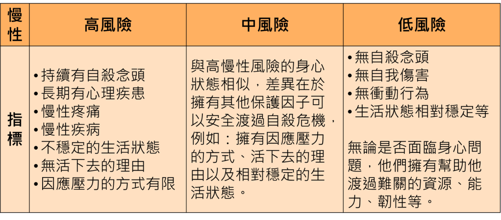 整合上述的資訊之後,可以將自殺風險分級與歸類。在這個架構之下,自殺風險可以區分成「急性風險」及「慢性風險」。急性風險 (acute risks) 指的是一個人當下(或近期)有自殺的風險;慢性風險 (chronic risks) 指的是一個人一生中的自殺風險。