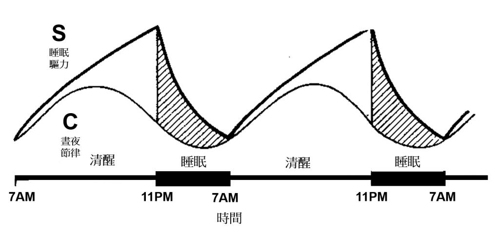 - Process S (睡眠驅力):隨著清醒的時間越長,睡眠驅力越高;睡覺之後,睡眠驅力也會下降。